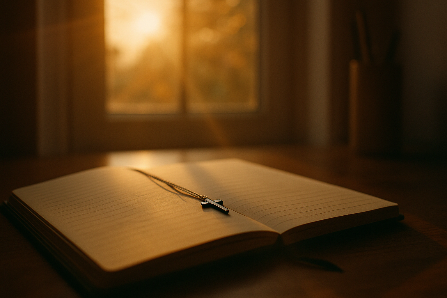 Sunlight streaming through a window onto an open notebook with a small cross pendant, evoking reflection and faith.